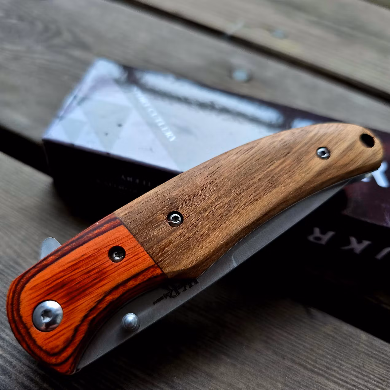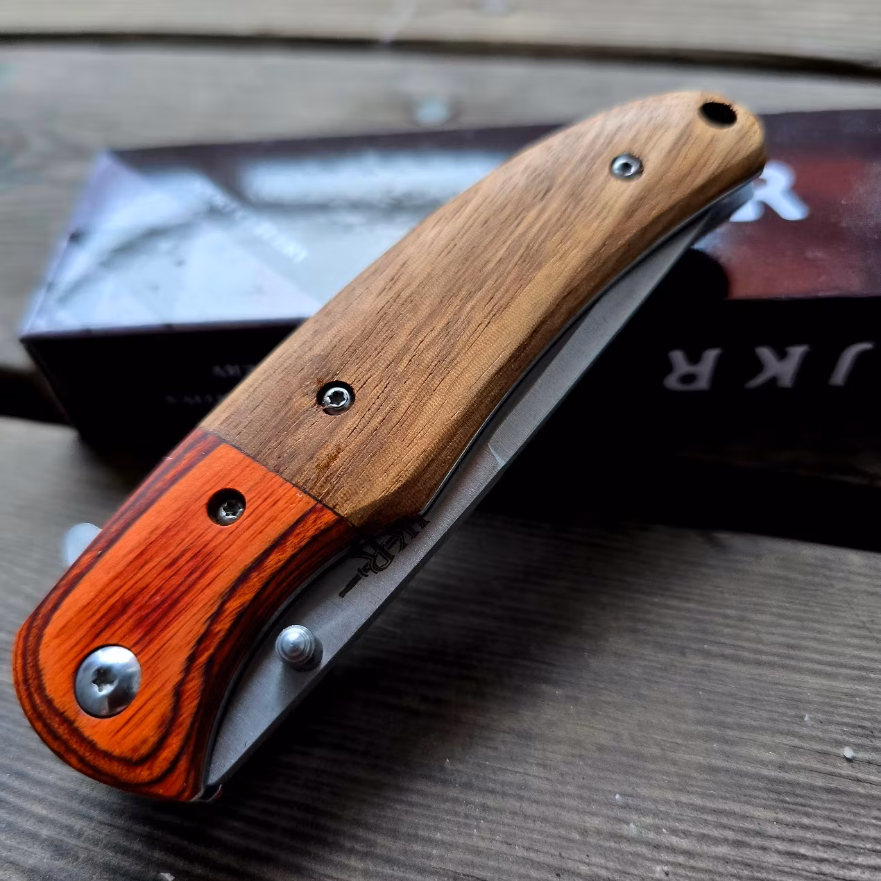 Träslagen är tåliga för fukt och knivens rostfria blad fälls enkelt in i handtaget med en hand genom tum skruven.