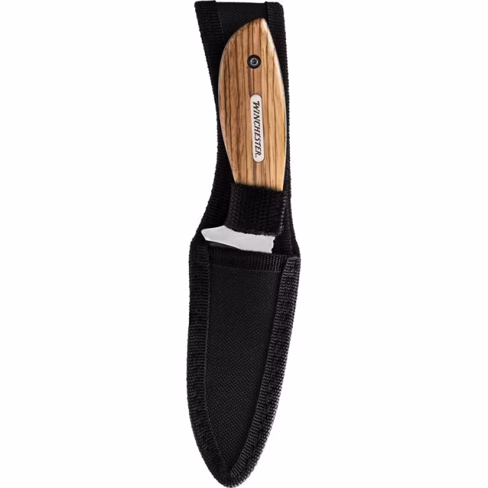 Winchester Barrens jaktkniven är en robust och mångsidig kniv som är perfekt för jakt och camping. Den är utrustad med ett fint blad och konstruerad med en hel tånge, vilket ger ökad hållbarhet och tillförlitlighet under olika utomhusaktiviteter. Bladlängden på cirka 80 mm gör den kompakt men ändå effektiv för hudningsapplikationer. Kniven levereras med ett tygfodral för enkel transport och förvaring. Dess handtag, tillverkat av zebraträ, ger inte bara ett säkert grepp utan lägger även till en estetisk attraktion till kniven.