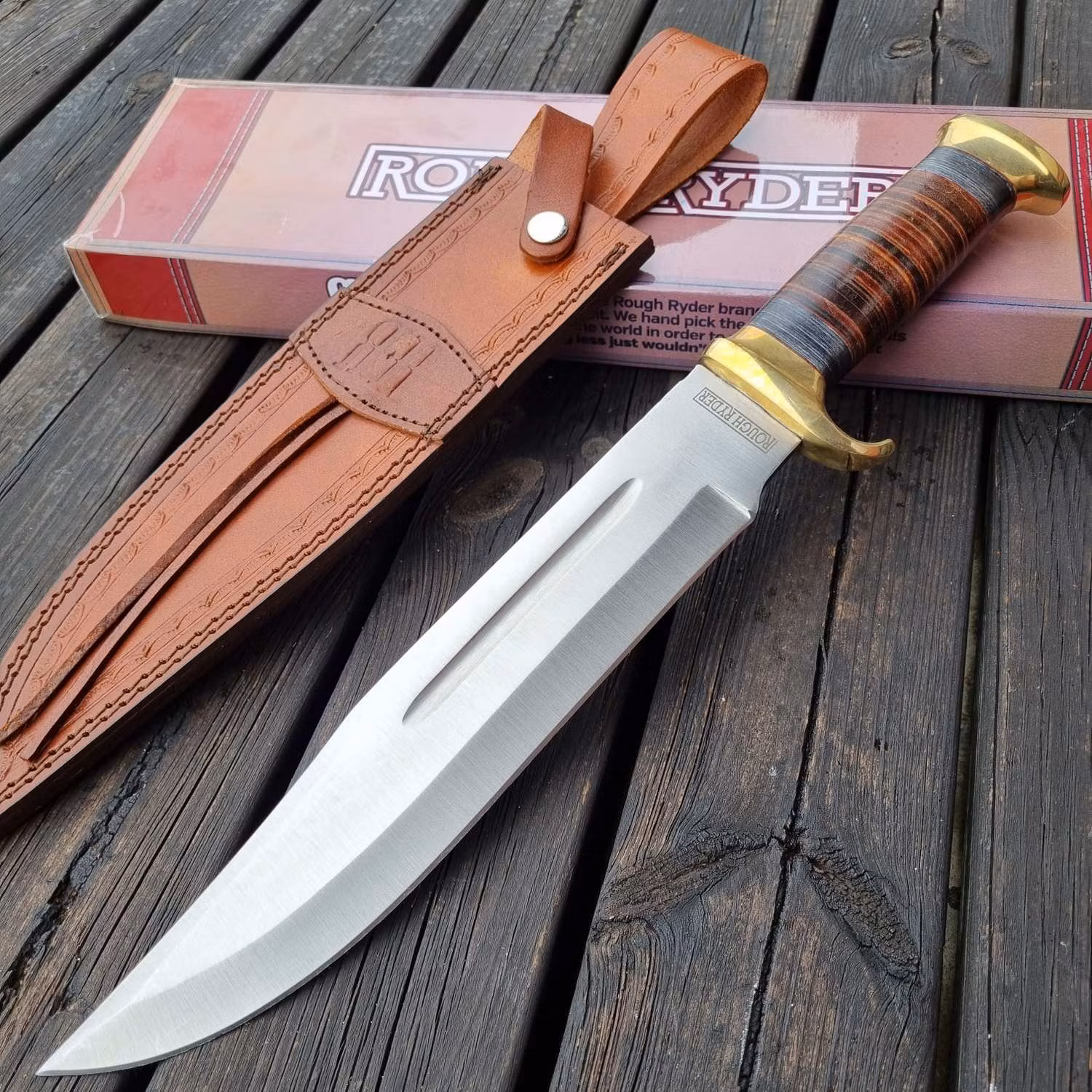 Denna stora, äkta bowiekniv är ett mästerverk av traditionell knivtillverkning och en imponerande följeslagare för den seriösa samlaren eller äventyraren. Med ett robust och vackert smitt blad i högkvalitativt stål och ett ergonomiskt handtag av premiummaterial, kombinerar denna kniv både funktion och estetik på bästa sätt. Den kraftiga storleken gör den idealisk för tuffa uppgifter som hugga ved, bearbeta trä eller användas i överlevnadssituationer. Oavsett om du söker en pålitlig friluftskniv eller ett samlarobjekt, levererar denna äkta bowiekniv både styrka och stil.