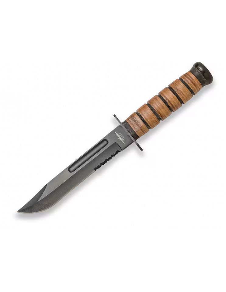 Det ergonomiska bruna handtaget i lindat läder ger ett stabilt och bekvämt grepp, även vid längre användning. Kombinationen av svart blad och brunt läder skapar en klassisk, taktisk design som förenar funktion och estetik. Kniven levereras med ett matchande brunt läderfodral, vilket möjliggör säker förvaring och smidig åtkomst i fält.