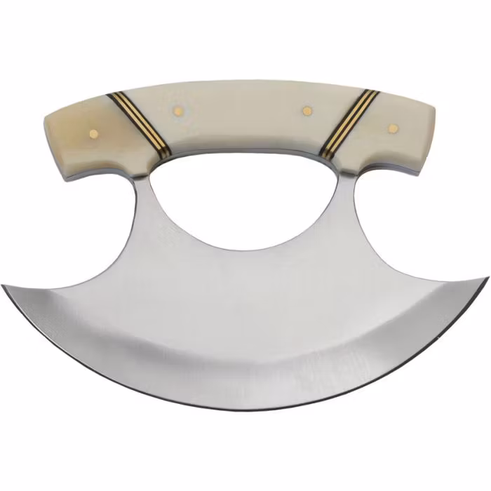 Rite Edge Ulu är en funktionell kniv med rötterna i inuitiskt hantverk. Det breda, halvcirkelformade bladet på 14 cm är tillverkat i rostfritt stål och ger en naturlig, gungande skärteknik som gör kniven effektiv vid allt från matberedning till bearbetning av kött och skinn. Handtaget består av polerat, vitt ben – ett stilrent, ljust utförande som ger kniven en exklusiv karaktär och ett stabilt grepp. Varje handtag har sin egen struktur och färgton, vilket gör varje exemplar unikt.