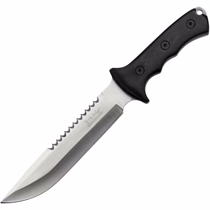 Bowiekniv med såg rygg knivblad tillverkat i 440 rostfritt stål.