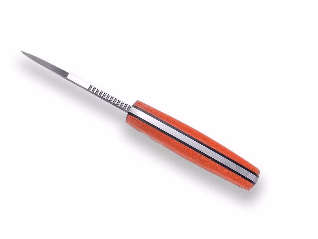 Knivens handtag i orange mikarta ger ett säkert grepp även i fuktiga förhållanden, samtidigt som den synliga färgen gör att du lätt hittar kniven om du tappar den i skog eller mark. Med en totallängd på ca 20 cm och en bladlängd på 8,2 cm är Erizo TS1 kompakt nog för att bära med sig, men kraftfull nog för tuffare uppgifter.